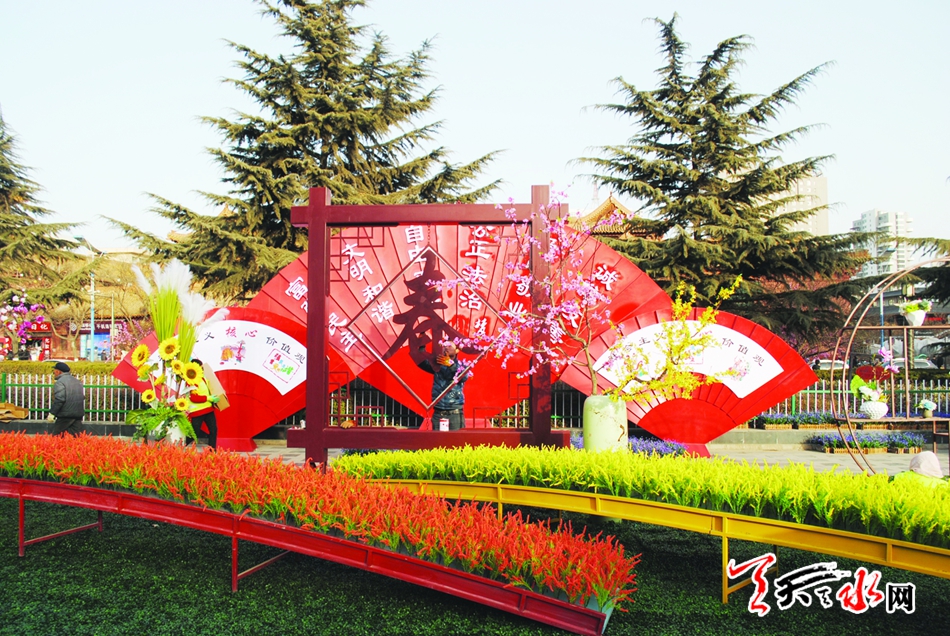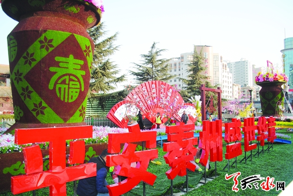 2月10日,在秦州区龙城广场,秦州区园林处施工人员正在抓紧作业,布置主题为“平安秦州、盛世华章”的花坛。