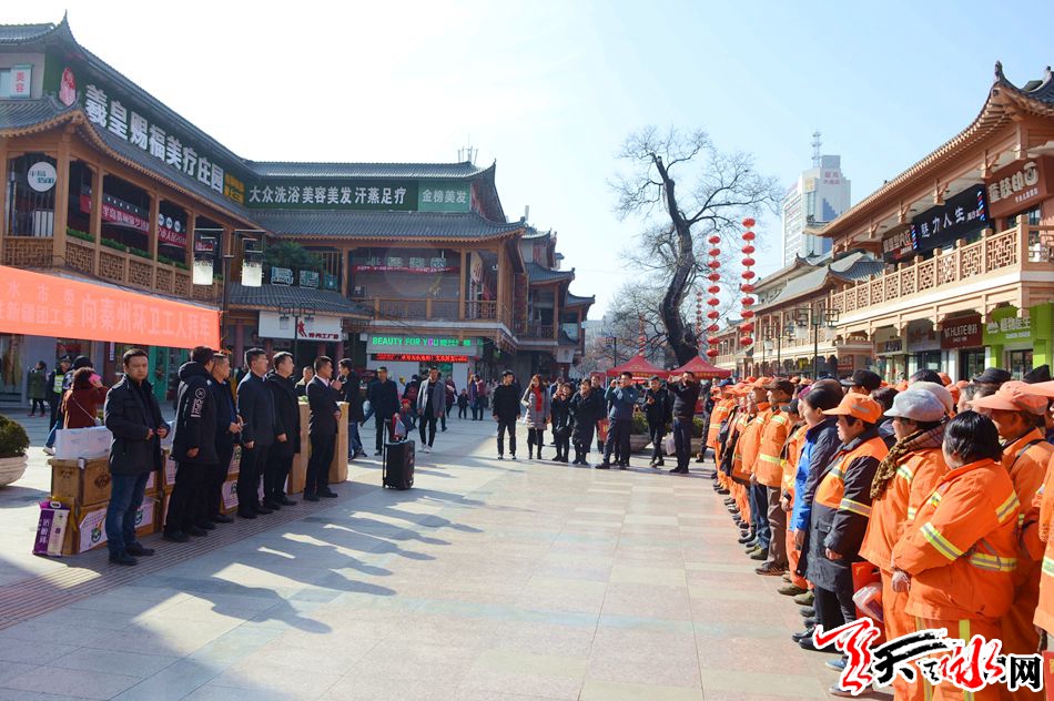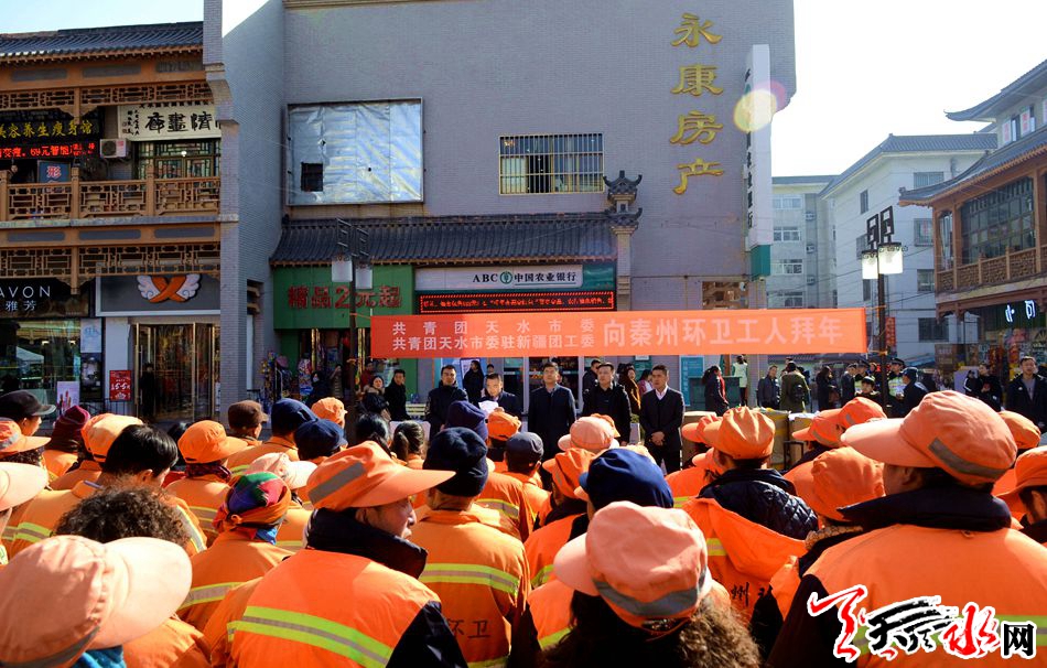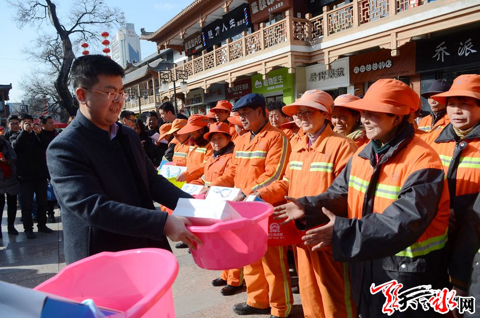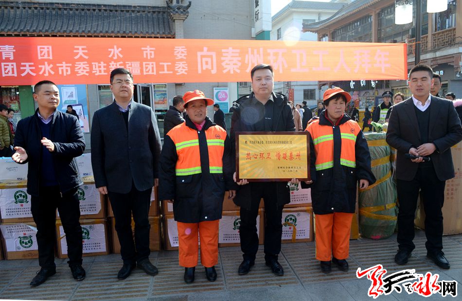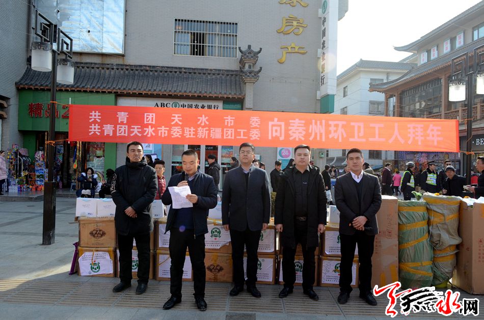 天天天水网讯【记者 张文都 】2月12日,值此新春佳节来临之际,共青团天水市委、共青团天水市委驻新疆团工委为秦州区全体环卫工人捐赠爱心物资发放仪式在秦州区步行街举行,这批价值近10万元的爱心慰问品为长期奋战在一线的环卫工人送上了新春的祝福。