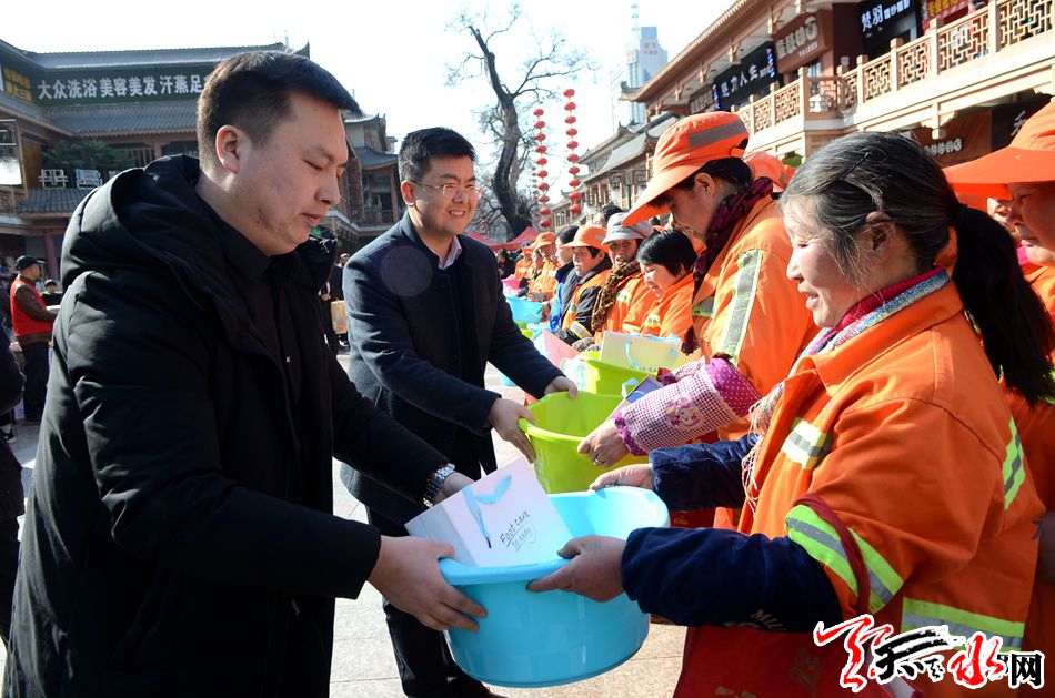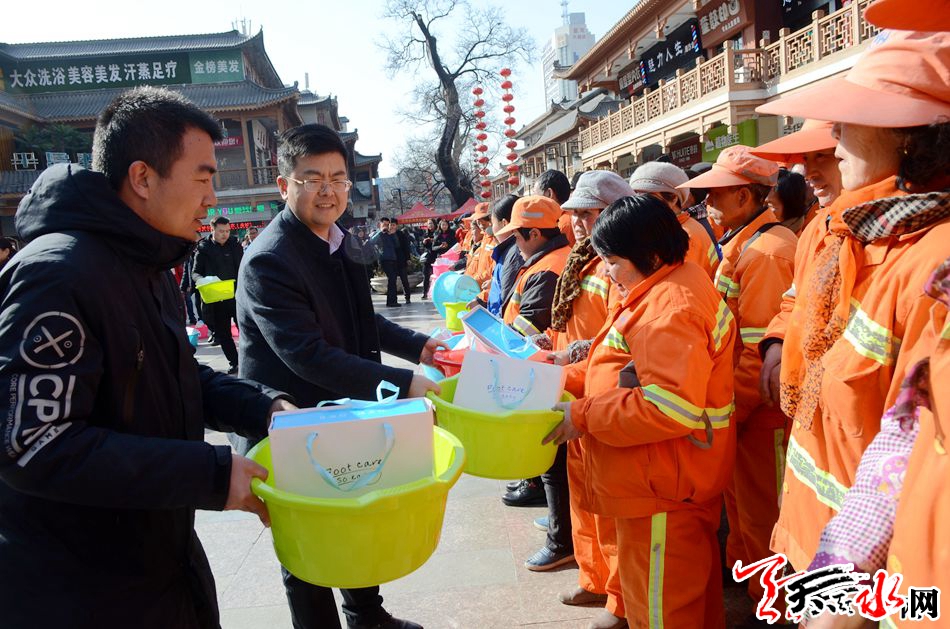 活动现场,秦州区环卫工人向共青团天水市委驻新疆团工委赠送了牌匾。20多名爱心志愿者为秦州区150名环卫工人发放了脚部保健礼盒及按摩盆,对环卫工人起早贪黑、顶风冒雨、不畏严寒、辛勤工作,为创造优美、舒适、洁净的市容环境所付出的辛勤劳动表示感谢,并对环卫工人致以崇高的敬意和新年的问候。