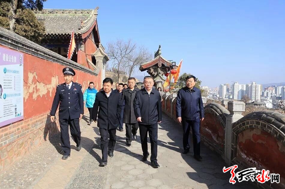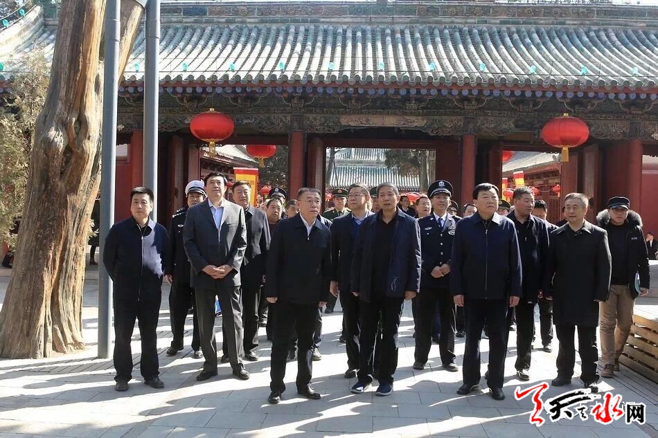 天天天水网讯【全媒体记者吴丽娜】2月22日下午,市委书记王锐带领市直及驻市有关部门负责同志,对伏羲庙和玉泉观春节文化庙会准备工作进行了督促检查。王锐强调,市、区两级和相关部门要进一步强化安全意识,靠实工作责任,细化工作方案,用钉钉子的精神把各项工作做细做实做到位,确保春节文化庙会活动安全有序进行。