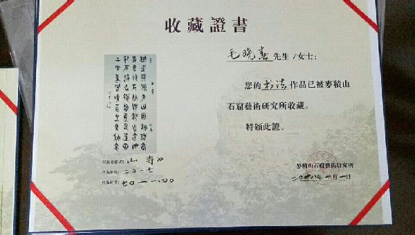 天天天水网讯 2018年春节,对于从北京回乡省亲的毛晓春来说是一个丰收的佳节,因为在他刚踏上故土之时,就收到麦积山石窟艺术研究所给他颁发的收藏证书,他2017年创作的一幅金石书法作品《山寺》被麦积山石窟艺术研究所收藏。