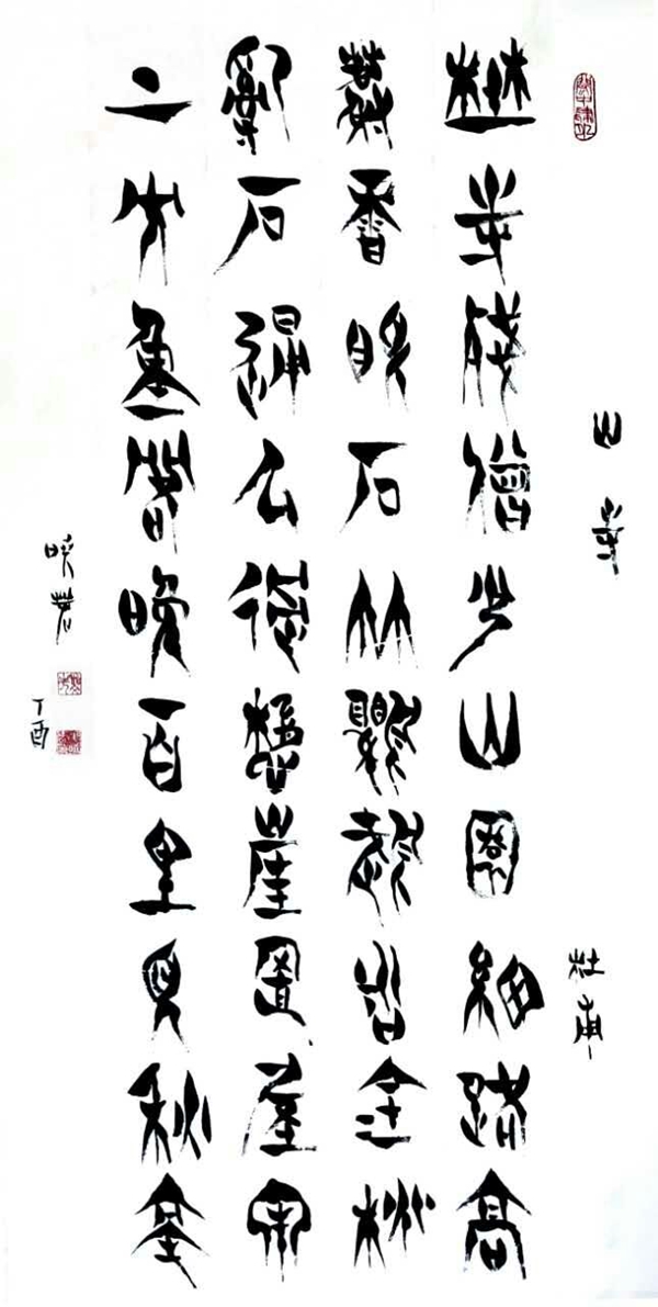 毛晓春还擅长用小篆或大篆书写长达数百乃至上千字的巨制,这首先要克服篆字字数有限的困难。所以我们在他的长篇巨制中,不仅能看到他扎实的书法功底,也能看到在古文字方面的扎实功力。其篆书中锋用笔,圆润遒劲,不急不滞,干净利落,匀平中有婀娜之态,流美中有深厚之感。小篆于平衡对称中尽曲直伸缩之妙,大篆结字则无论奇正、虚实、疏密、向背、对比、照应皆能在出奇制胜中不失稳健,在规整匀平中自寓巧思,从而达到齐而不齐,平而不平的效果,耐人寻味。