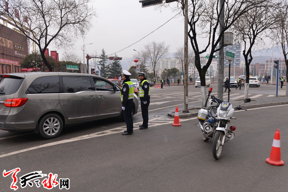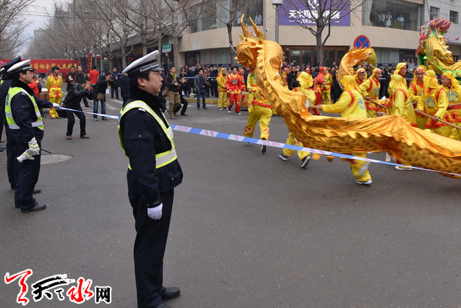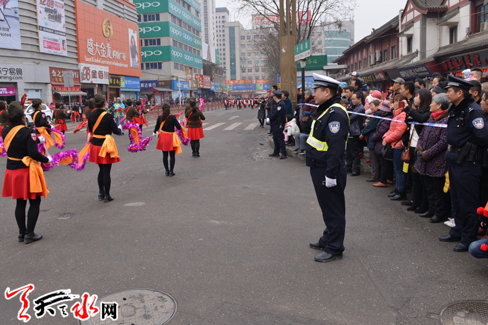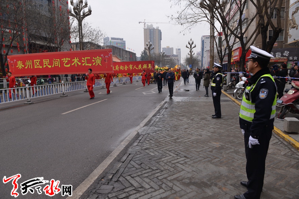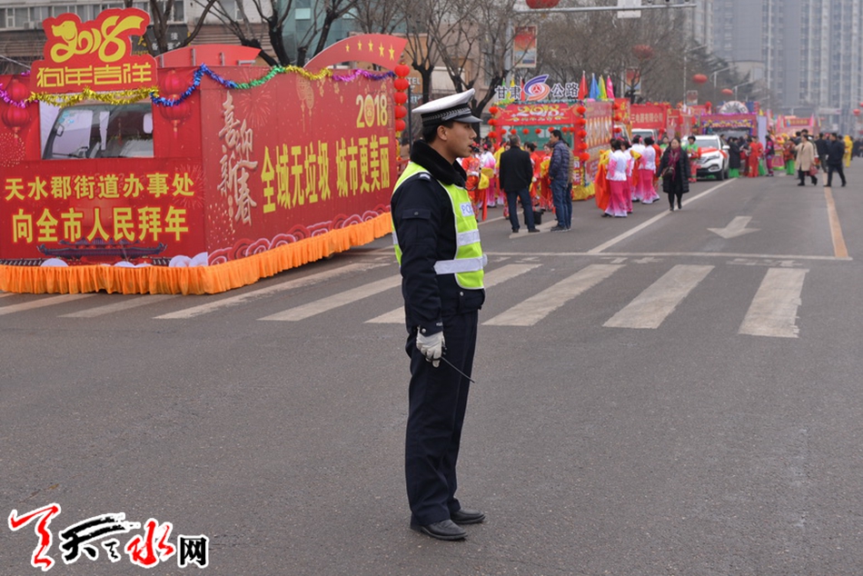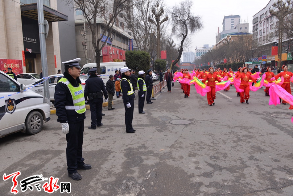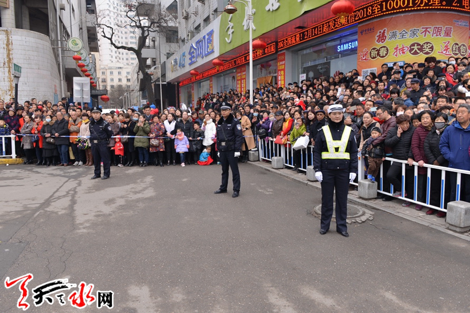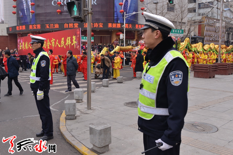 天天天水网讯(通讯员刘冀远)2月27日(农历正月十二)上午,天水市秦州区锣鼓喧天、龙腾狮舞,处处洋溢着欢乐喜庆的节日氛围,引得市民纷纷驻足观看。为保障2018年秦州区春节民间艺术汇演活动顺利举行,天水公安交警部门根据辖区实际,结合历年活动保障经验,科学制定勤务,提前向社会发布出行提示信息。活动当天,全体执勤交通民警及协管员按时到岗到位,对合作巷十字、藉滨桥十字、重新街北口等路段进行临时交通管制,指挥车辆分流绕行,引导过往群众有序观看。