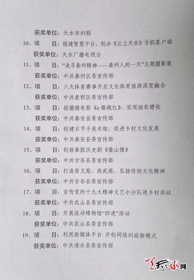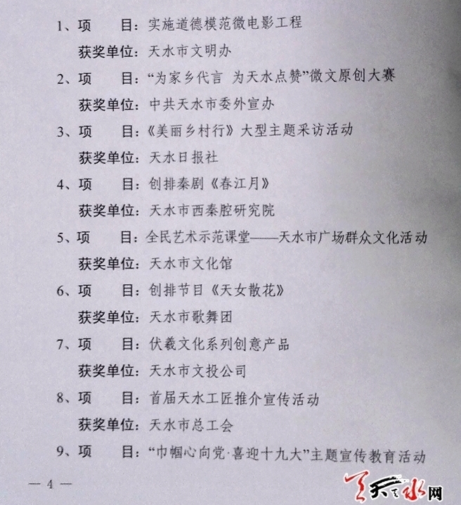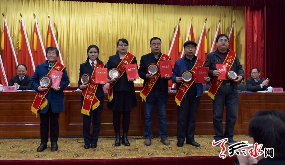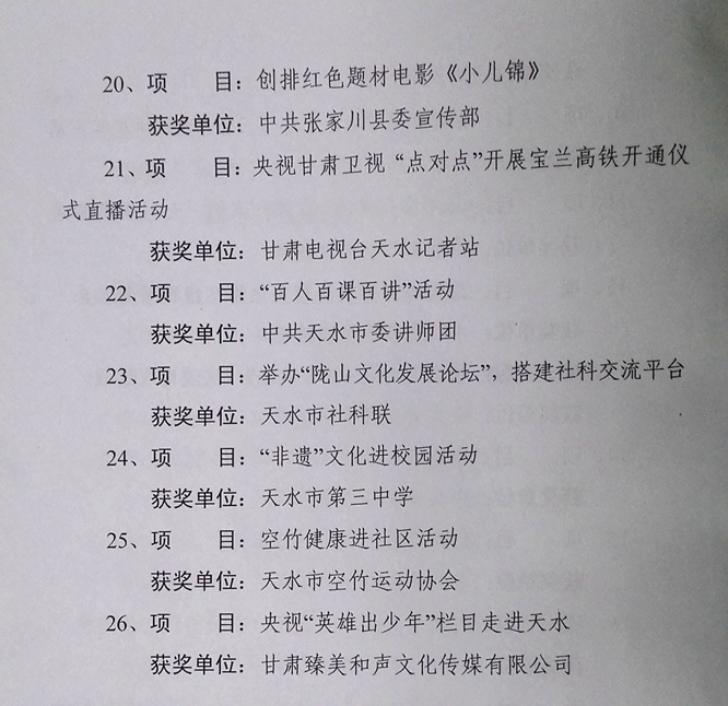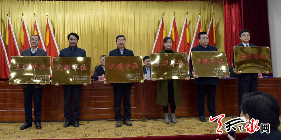 ▲甘谷县、秦安县、天水日报社、市总工会、市妇联、甘肃臻美和声文化传媒有限公司等单位荣获2017年度全市宣传思想文化工作特色创新奖。