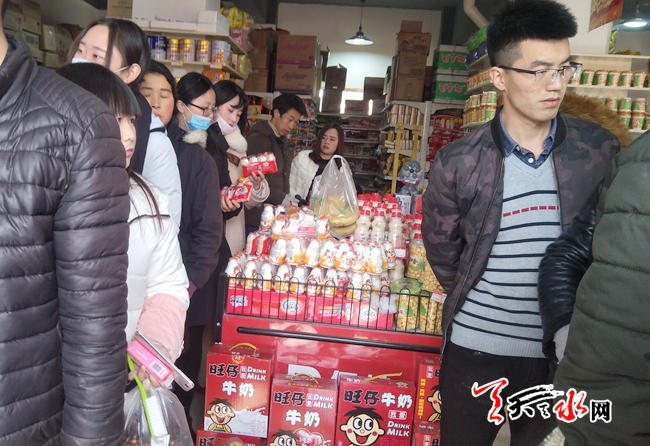 “东西拿好一个一个来,我们还不着急下班。”近日,在秦州区齐寿镇一家超市里,收银台前围满了等着结账的人,超市工作人员一边整理货物,一边引导大家维持秩序。