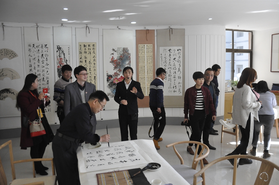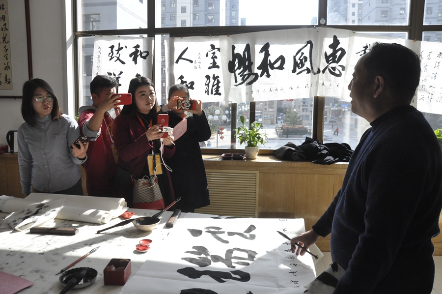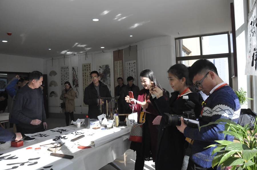 在社区的艺术之家,采访团遇到社区正在进行“党员固定学习日”的书画笔会活动,社区居民在宽敞明亮的活动实力进行书画创作与交流,他们有的挥墨书写,有的精描细画,墨香飘荡,书画同彩。居民温玉中在4尺宣纸上写下了“祥云瑞气”四个大字,他高兴的对记者说,新时代、新生活、新家园、新气象都是祥云瑞气,这四个字表达了我们小区居民对美好生活的向往。