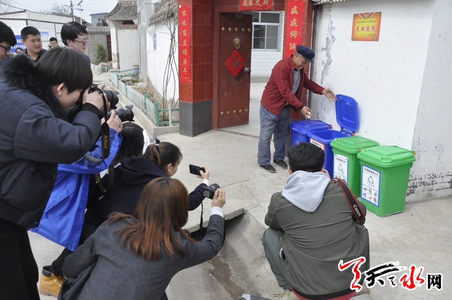 采访团一行走进张忠孝的家,在他家大门外的白墙上,张贴着一张镇政府颁发的“美丽庭院”的牌子,干净整洁的庭院里一只小狗在懒懒的晒着太阳,见有陌生人进来,本能的摇晃着尾巴。洁白瓷砖贴就的墙上红色的春联显得格外醒目,他告诉采访团,自从政府在村里实行美丽乡村建设以来,以前遍地的垃圾污水不见了,村庄慢慢的变美了,变干净了,现在村上统一在道路两边、巷道里和每家门前都配备了垃圾桶,村民也慢慢习惯了垃圾入桶,村民自家清扫自家周围的卫生,公共区域的卫生也有专人清扫,所有垃圾集中起来后由专业车辆定时运走。