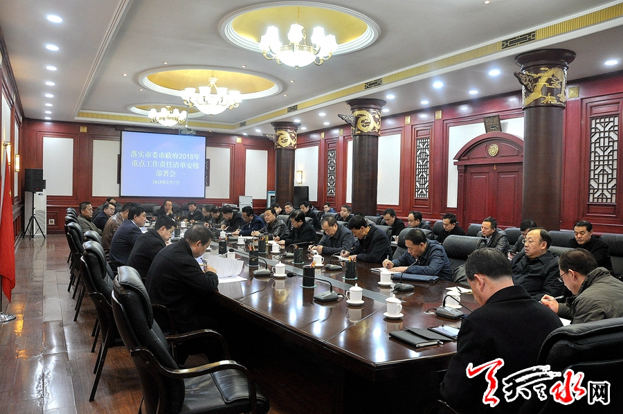 天天天水网讯【记者童强】3月7日,市委常委、常务副市长赵卫东主持召开落实市委、市政府2018年重点任务责任清单安排部署会议。重点落实《市委办、市政府办关于印发2018年工作任务清单的通知》和《市政府办公室关于分解落实2018年市政府重点工作任务的通知》,安排部署文件明确的牵头主抓的各项工作任务。