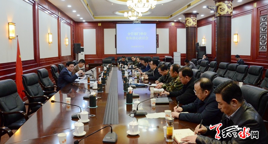 天天天水网讯【记者童强】3月7日,市委常委、常务副市长赵卫东约谈分管部门、单位领导班子集体。就全面从严治党主体责任落实情况进行约谈,及时查找分析思想、工作等方面的一些问题,进一步引导大家树牢“四个意识”,坚持党性原则,守纪律讲规矩,全面落实党风廉政建设责任制和个人廉洁自律各项规定,建设忠诚、干净、担当的关键少数,推动中央、省、市委各项决策部署全面落实。