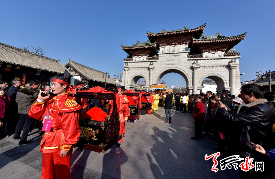 “太昊伏羲祭典”礼仪的一项重要内容——迎圣水仪式,是首批国家级非物质文化遗产保护项目之一。仪式中,身着礼仪服装的祭祀人员,将伏羲行像从明代建筑太极殿内,迎请至先天殿月台。之后,恭请方神黑爷至伏羲庙院内,在泮池前举行取圣水仪式,寓意取东海、南海、北海和西海的“四海”之水,供奉于伏羲。接着,伏羲圣像、方神黑爷像在浩浩荡荡仪仗队伍的“护驾”下出伏羲庙大门至戏楼前,举行了出榜文仪式。