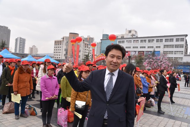 张维林欢送 400 多名打工者外出务工。2018 年以来,该公司已输转劳动力 8700 多人。(新华社记者 王朋 摄)