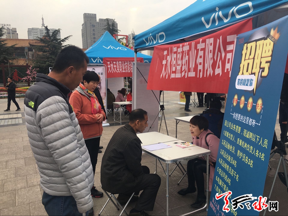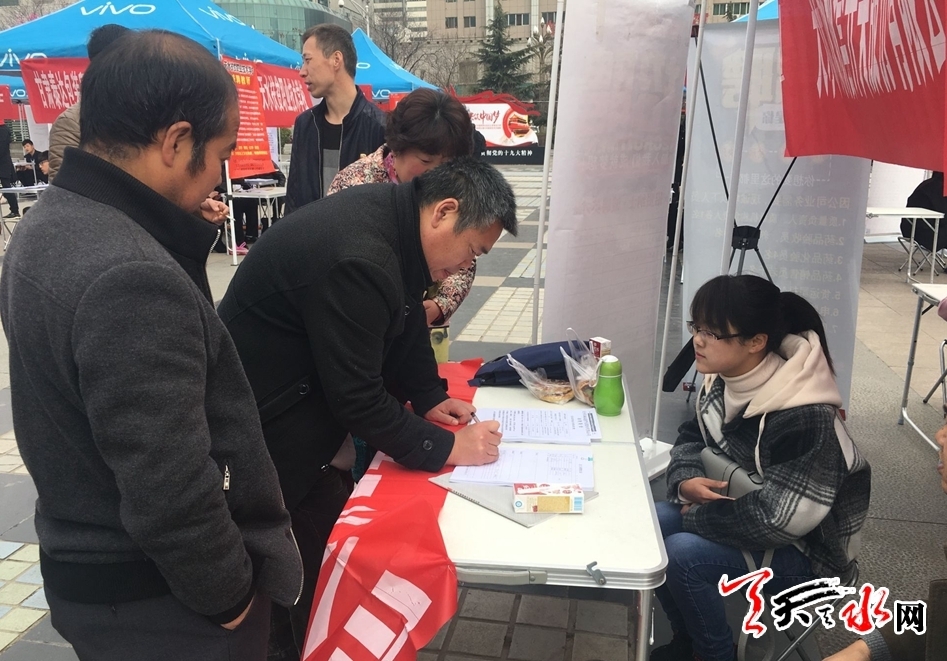 3月10日上午,由市总工会、秦州区总工会主办的天水市2018年“春风行动”专场招聘会在龙城广场举行。本次招聘会主要面向社会未就业的下岗职工和农民工、农村劳动力转移人员、青年、高校毕业生及社会其它各类人群。参加本次招聘会企业有68家,现场参加应聘的人员达1000多人次。记者 陈娟 摄