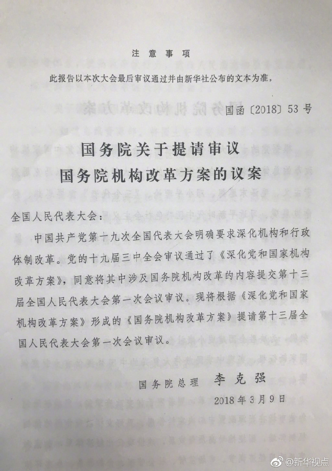 根据国务院组织法规定,国务院组成部门的调整和设置,提请全国人民代表大会审议批准。(据新华社“新华视点”微博)