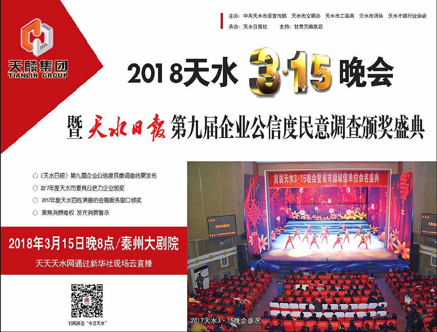 天天天水网讯 【记者 朱君芳】企业用诚信铸就品牌,社会因诚信而文明发展。3月15日晚8时,由中共天水市委宣传部、天水市文明办、天水市工商局、天水市消协、天水市银行业协会主办,天水日报社承办,甘肃天麟集团协办,甘肃景园集团鼎力支持的“诚信服务和谐消费2018天水市3·15晚会暨《天水日报》第九届企业公信度民意调查活动颁奖盛典”将在秦州大剧院隆重举行。