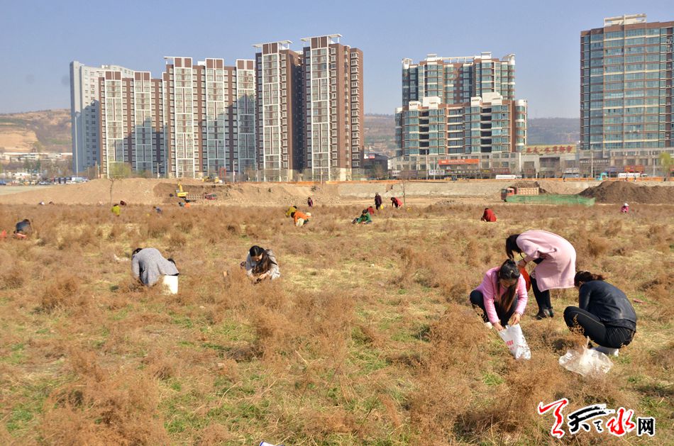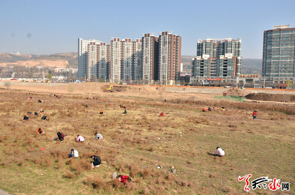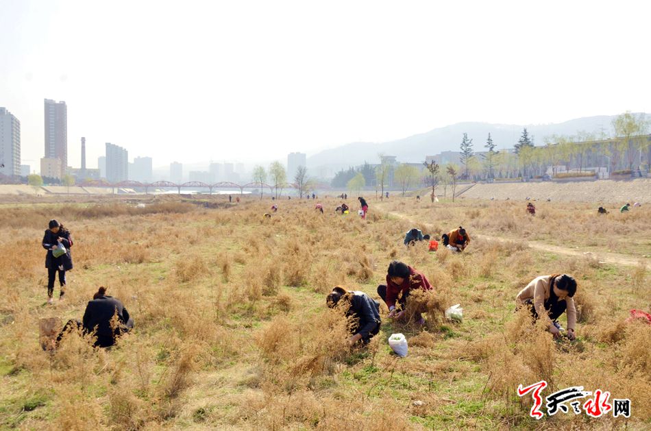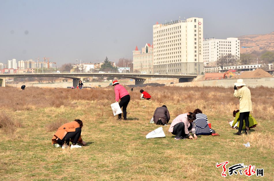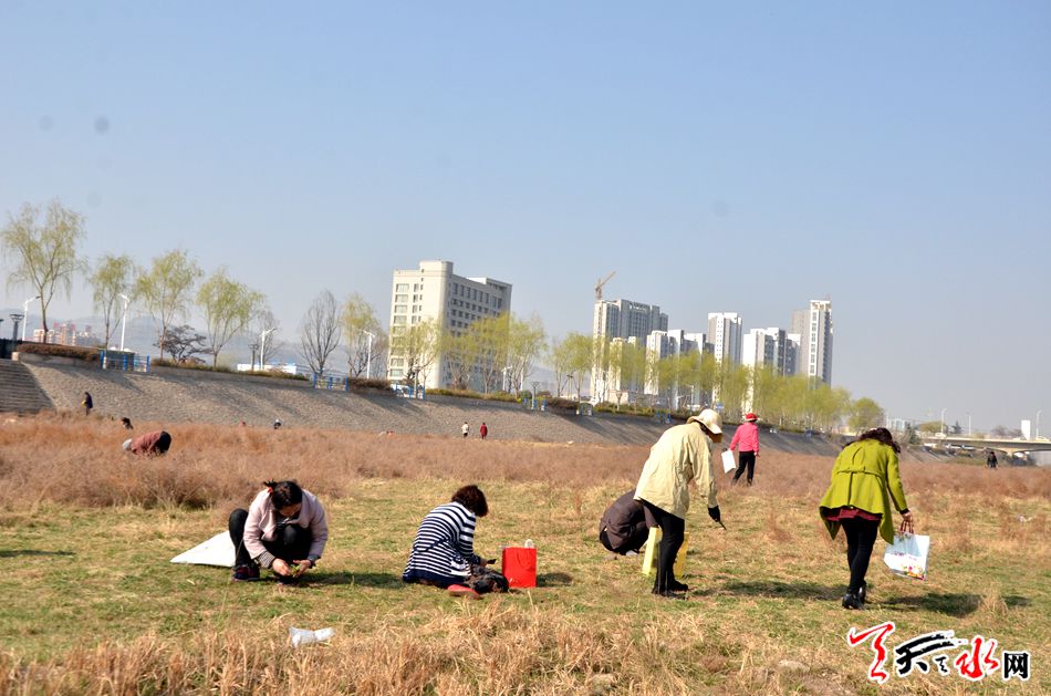 阳春三月,万物吐绿,春风吹出了姹紫嫣红的山村美景,也唤醒了在泥土里沉寂一冬的青翠嫩芽,这些顶破泥土芬芳的应时野菜,成为市民争相满足口腹之欲的佳肴。3月15日,在天水师范学院附近的河滩上,市民成群结队采摘野菜的场景蔚为壮观,构成了一幅春色满园靓丽的景象。