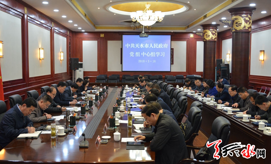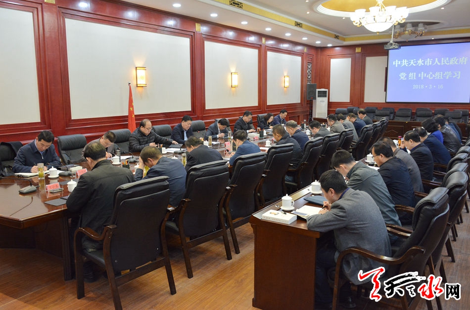 天天天水网讯【记者辛闻】 3月16日下午,市政府党组书记、市长王军主持市政府党组理论学习中心组学习,原原本本学习了党的十九届三中全会公报、习近平总书记在2018年春节团拜会上的重要讲话、《习近平谈治国理政》第二卷第一个专题有关内容和中央、省、市贯彻执行中央八项规定精神的有关文件。市政府党组副书记赵卫东,党组成员宫辉、张建杰、郝文杰、王燕、程伟东、王祥林参加。