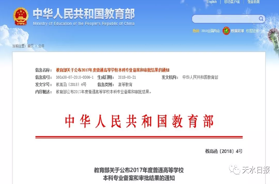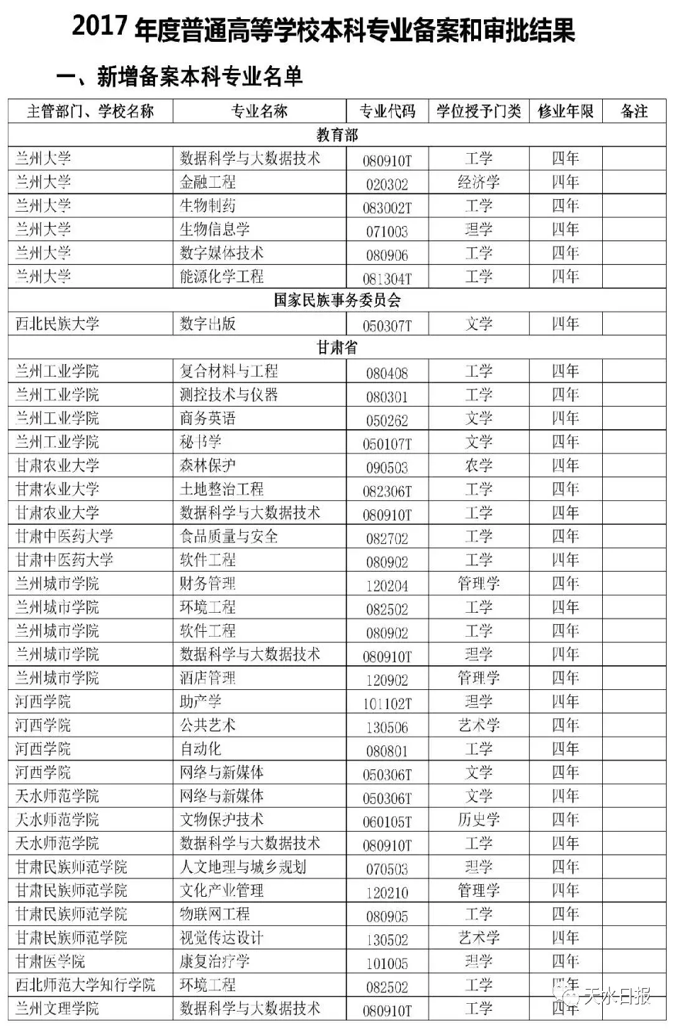 3月21日,教育部公布了2017年度普通高等学校本科专业备案和审批结果。甘肃省12所高校新增备案本科专业40个,3所高校新增审批本科专业5个;1所高校撤销本科专业1个。