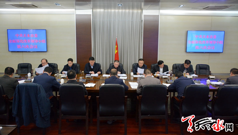 会议传达学习了中央、省委全面深化改革领导小组会议和省委全面深化改革领导小组《关于2017年全面深化改革工作总结的报告》精神,讨论审议了《中共天水市委全面深化改革领导小组2018年工作要点》《中共天水市委全面深化改革领导小组2018年工作台账》《中共天水市委全面深化改革领导小组领衔推动改革落实暂行办法》《天水市落实全面深化改革责任的实施意见》《天水市全面深化改革工作考评办法(试行)》《天水市全面深化改革工作容错纠错实施办法(试行)》,研究部署今年全市全面深化改革工作。