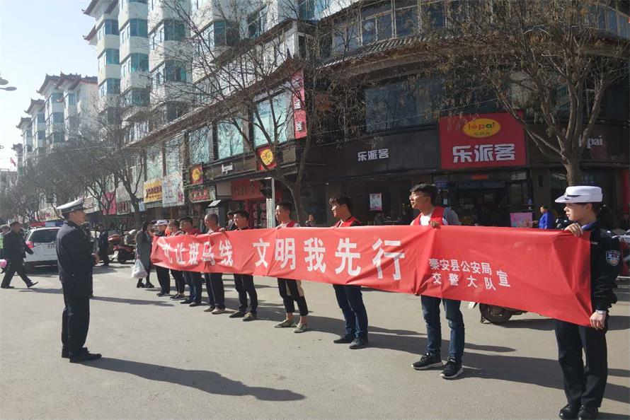 秦安县公安局交警大队在新华街什字开展了以“礼让斑马线 文明我先行”为主题的宣传活动。大队民警及文明劝导志愿者在新华街十字通过散发传单、悬挂宣传横幅等多种形式广泛宣传,劝导过往的行人、机动车驾驶员、非机动车驾驶员,自觉遵守道路交通法律法规,提醒车辆在斑马线前注意减速慢行、不抢道、礼让行人优先通过,引导行人走斑马线、不随意横穿马路、不得翻越护栏,杜绝不文明交通行为,并通过自己的行动去影响和带动身边的人自觉文明行车、遵守交通法规,使“礼让斑马线”成为秦安的一道靓丽风景。