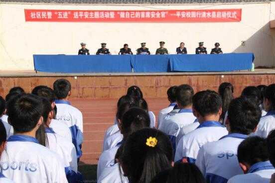 3月27日下午,我县民警“五进”送平安主题活动暨“做自己的首席安全官”——平安校园行清水县启动仪式在清水县第六中学举行,全校近2500名师生和40多名公安干警、交警和消防官兵参加了启动仪式。黄门学区、陇东中学、白沙学区、三幼等学校在各自校园内同步开展了“平安校园行”主题活动。