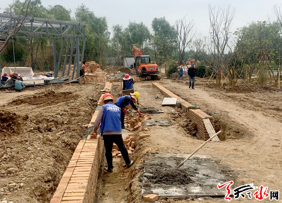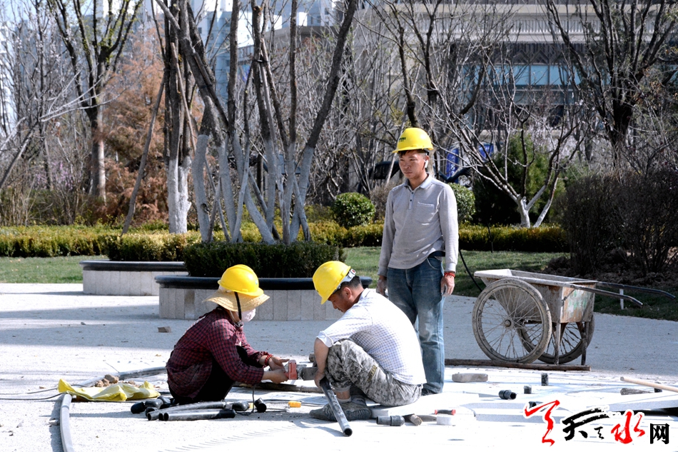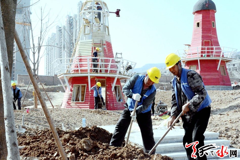 3月28日,天水成纪儿童公园项目工地工作人员正在抓紧施工。据了解,成纪儿童公园已完成乔木及部分灌木的栽植、土建、铺装、儿童活动器材的安装等工程,正在实施苗木补栽、景观节点小品及管理用房等工程,预计6月投入使用。 记者 徐媛 摄