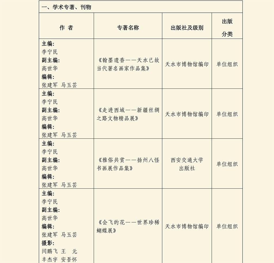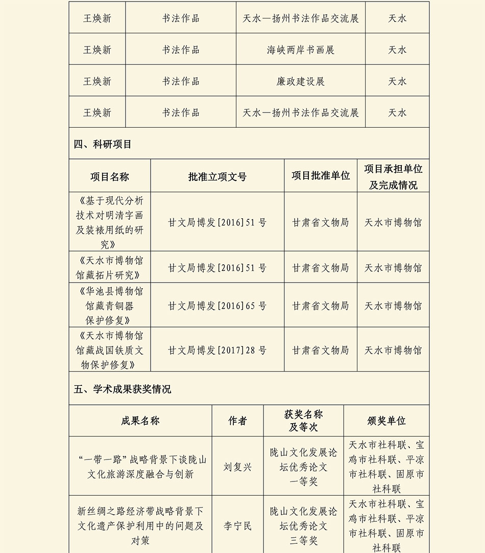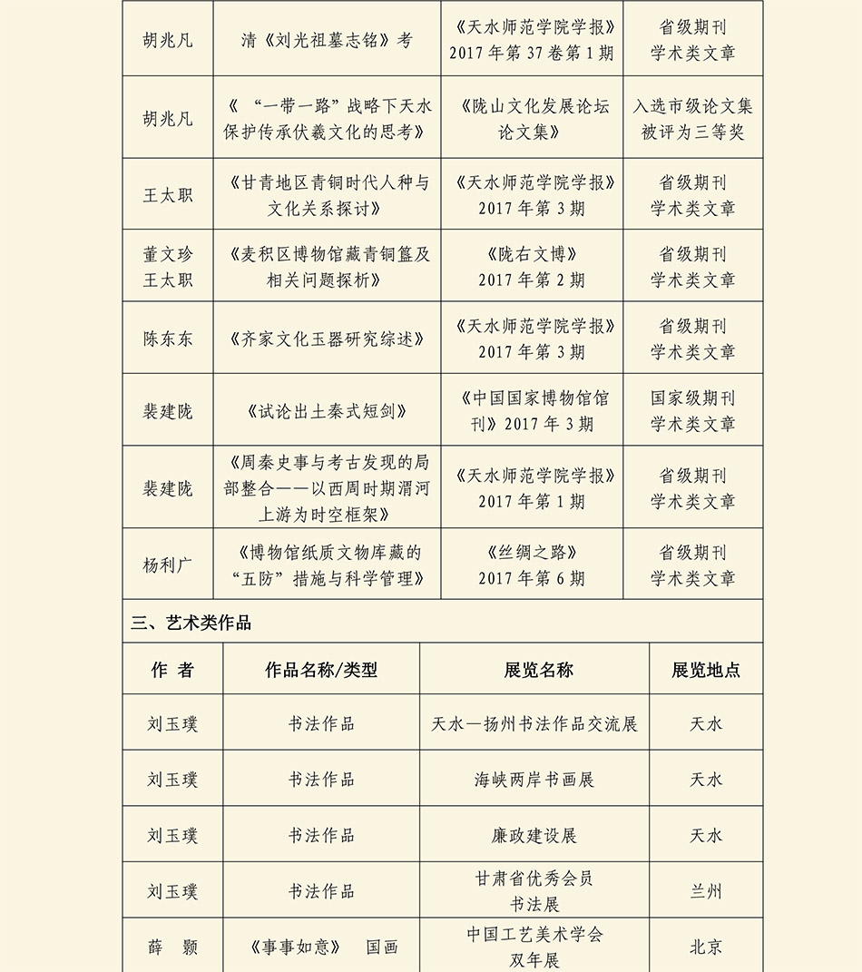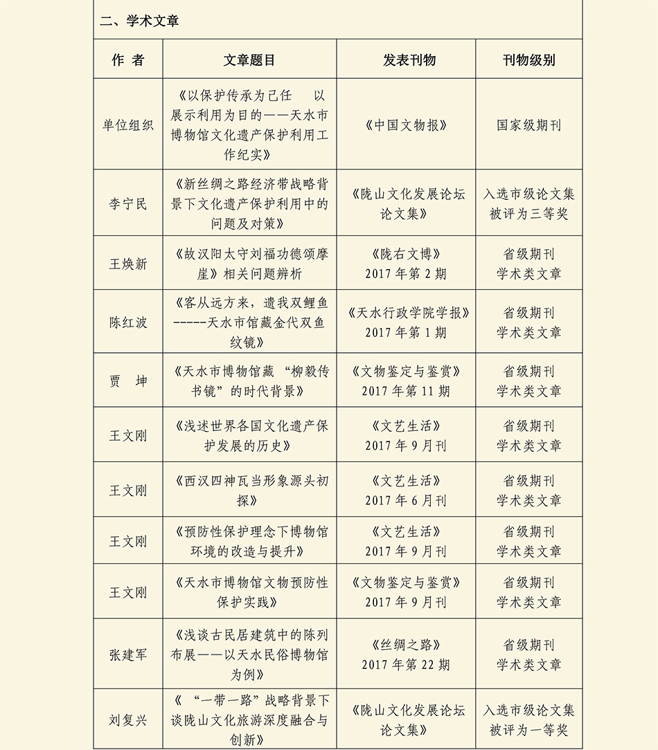 天水市博物馆 天水市伏羲庙管理局 2017年度学术研究成果统计