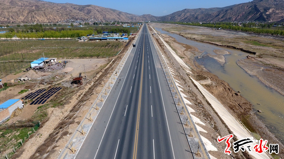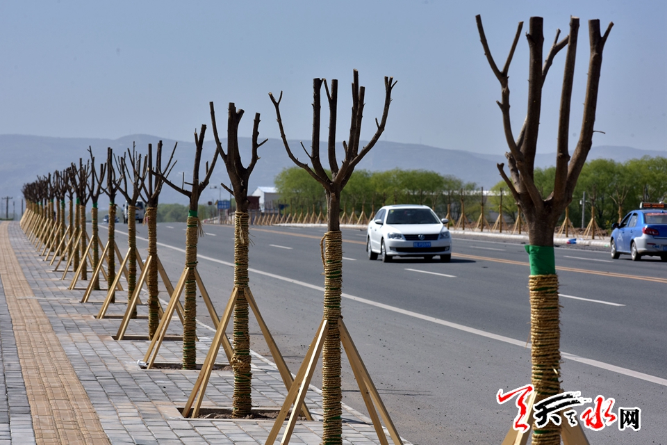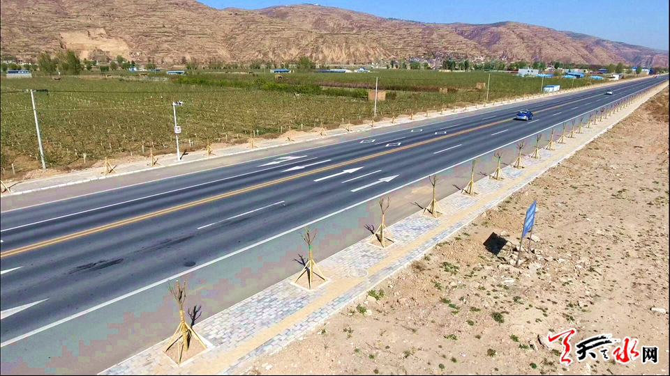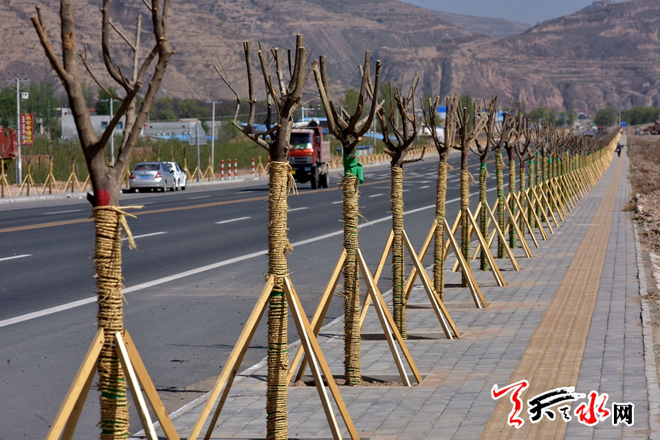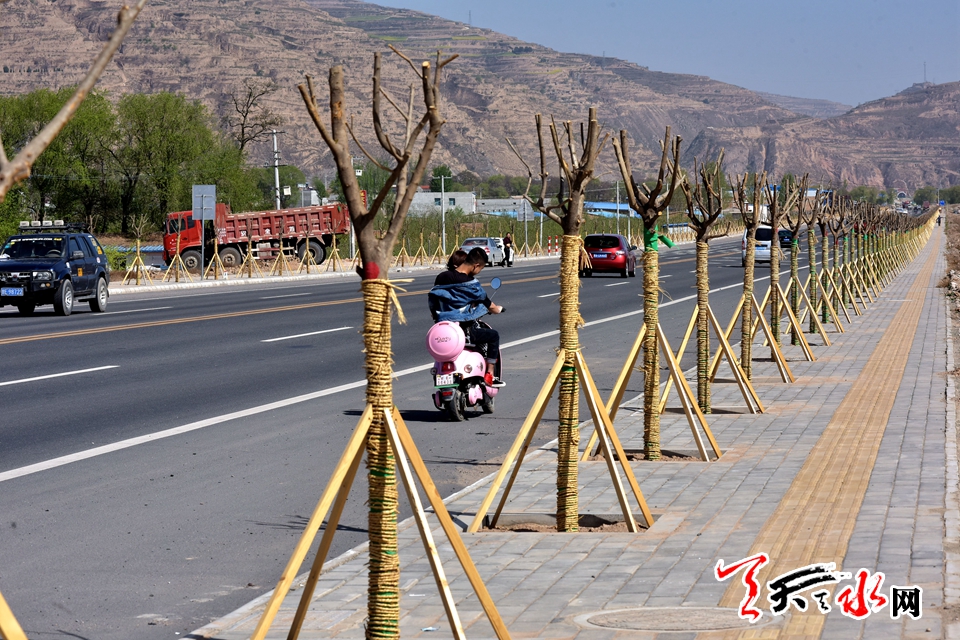 迎着春日的暖阳,沿麦甘公路一路向西,当汽车行驶 出六峰隧道后,映入眼帘的是一条笔直的公路,和2600株栾树、大叶女贞在道路两侧画出的两道绿色线条,在这个春季为麦甘公路甘谷段9公里的道路上画出了一道美丽的线条。
