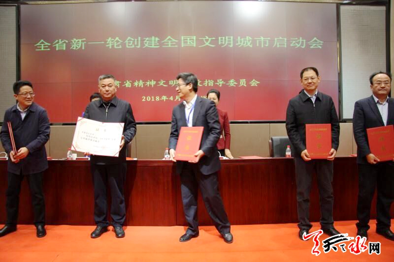 天天天水网讯【记者辛闻】4月18日,甘肃省新一轮创建全国文明城市启动会在嘉峪关市召开。会议以实地观摩、交流发言等形式贯彻落实中央和省委关于创建全国文明城市工作的总体部署要求,总结宣传我省创建全国文明城市典型经验,安排部署全省新一轮全国文明城市创建工作,为全省12个新一轮全国文明城市提名城市颁发荣誉证书,天水市、清水县名列其中。省委常委、省委宣传部部长、省文明委副主任陈青出席会议并讲话。