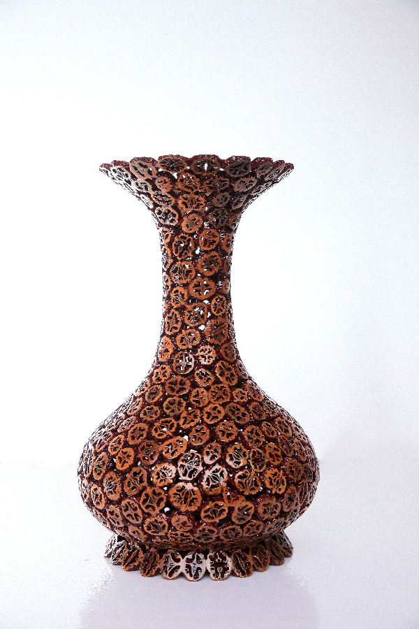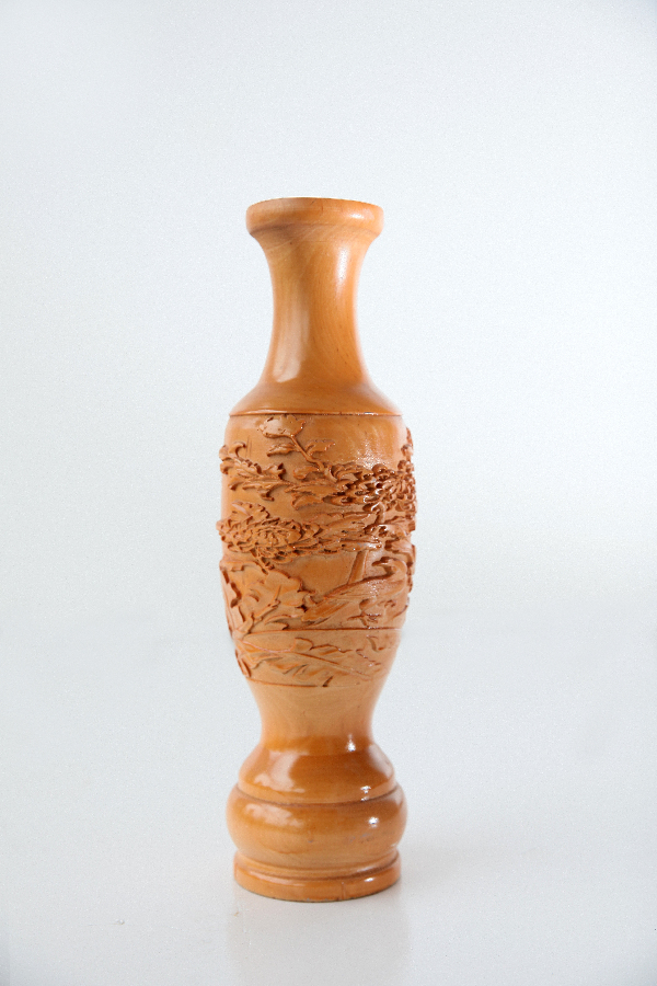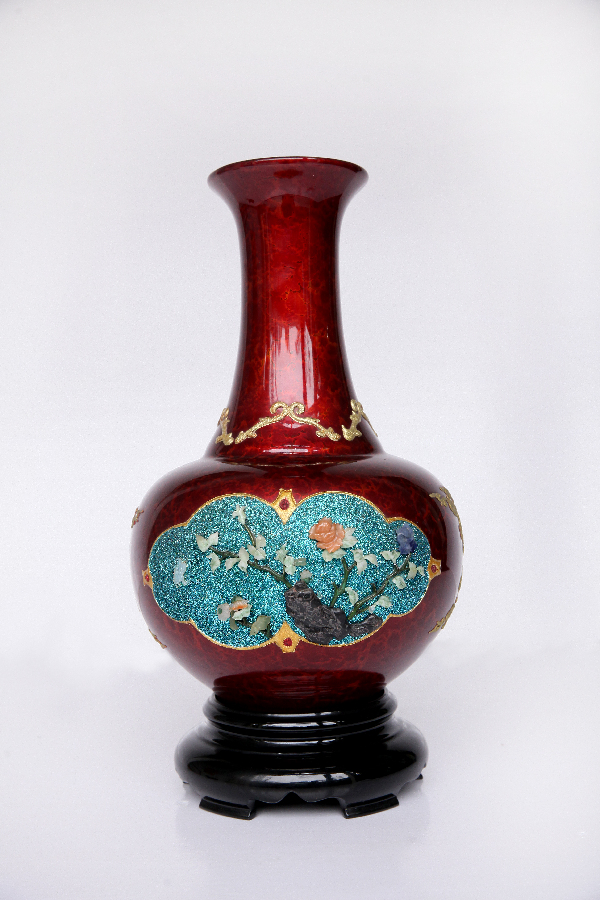 赤宝砂嵌玉花瓶 作者:刘宝平申报单位:天水黄河雕漆工艺有限责任公司