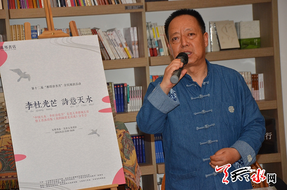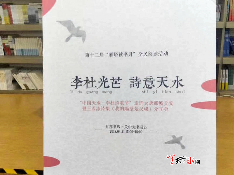 天天天水网讯【记者胡晓宜】4月21日下午,由“中国天水•李杜诗歌节”组委会、甘肃省作家协会、陕西省作家协会、西安市雁塔区委宣传部主办,西安万邦书城、西北旅游文化研究院、天水日报社、王若冰文化工作室承办的“中国天水•李杜诗歌节”走进大唐都城长安暨王若冰诗集《我的隔壁是灵魂》分享会,在西安市万邦书城关中大书房举行。