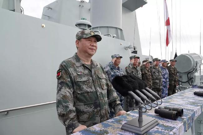 习近平主席检阅部队并发表重要讲话。他强调,“在新时代的征程上,在实现中华民族伟大复兴的奋斗中,建设强大的人民海军的任务从来没有像今天这样紧迫。要深入贯彻新时代党的强军思想,坚持政治建军、改革强军、科技兴军、依法治军,坚定不移加快海军现代化进程,善于创新,勇于超越,努力把人民海军全面建成世界一流海军。”