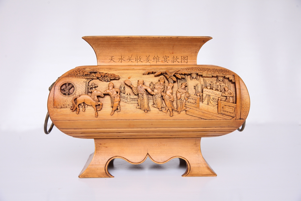 竹雕天水关收姜维宴款图尊 作者:吴云生申报单位:天水市竹艺文化研究中心