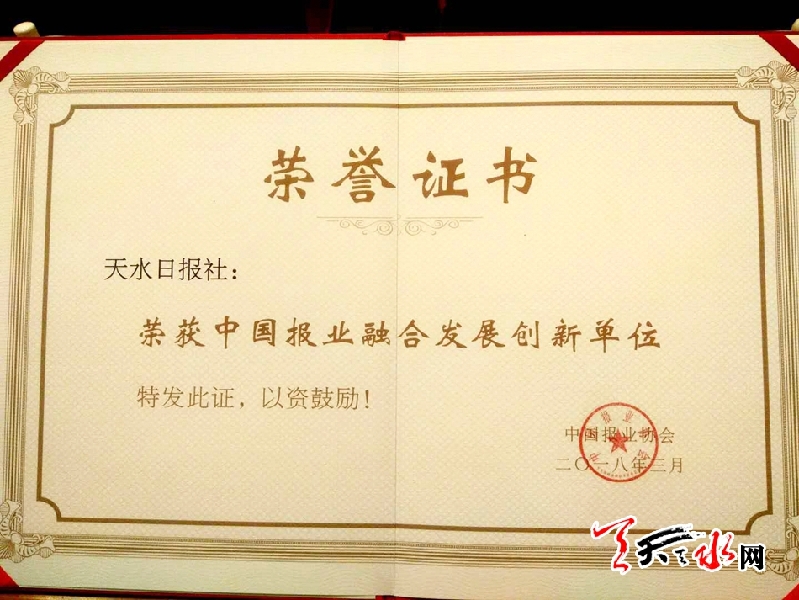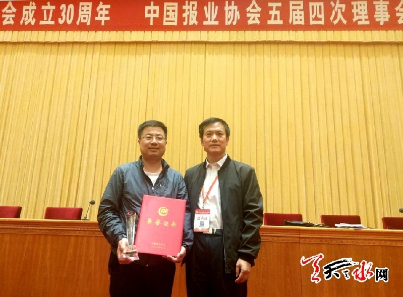 天天天水网讯【记者杨焕周】4月26日,中国报业协会在京举办成立30周年纪念活动,同时召开五届四次理事会暨中国报业发展大会。会议总结了中国报业协会2017的工作,安排了2018年的工作,并就报业深化改革、推进深度融合、媒体转型发展、智能媒体等内容进行了交流,表彰了一批报业融合发展创新单位和报业经营管理领军人物、先进个人及报业技术创新融合发展奖,天水日报社荣获创新单位荣誉。