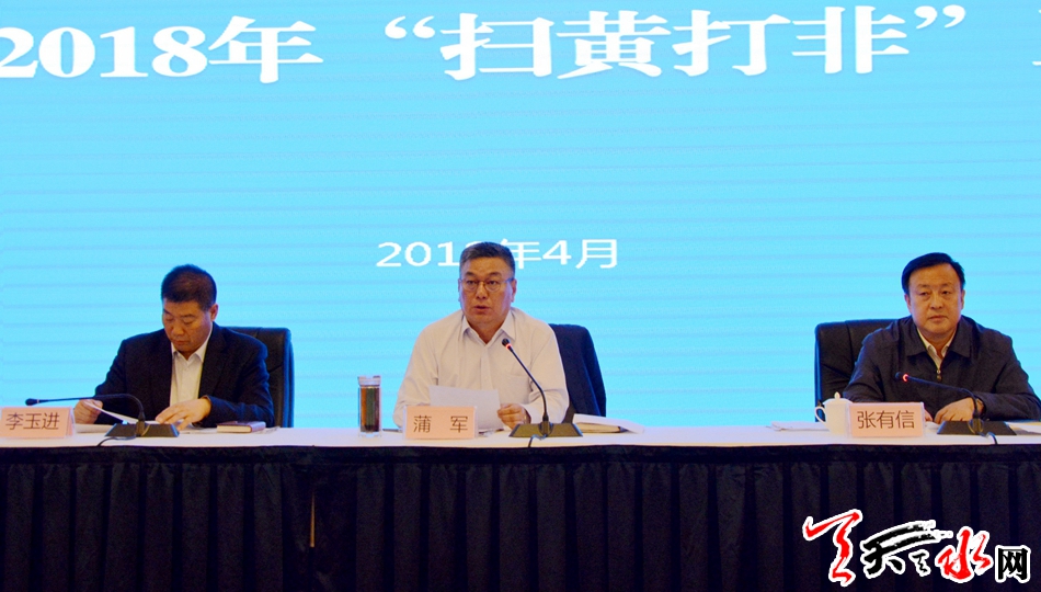天天天水网讯 4月26日上午,我市召开2018年全市“扫黄打非”工作会议。市委常委、宣传部长、市“扫黄打非”工作小组组长蒲军出席会议并讲话,市政府副秘书长张有信主持会议。