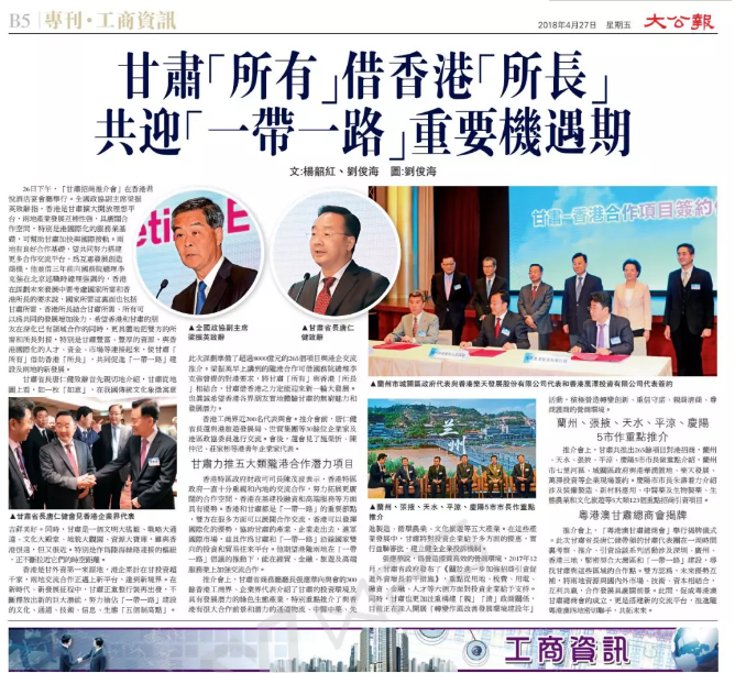 大公网4月26日电(记者杨韶红、刘俊海)26日下午,“甘肃招商推介会”在君悦酒店宴会大礼堂举行。全国政协副主席梁振英致辞指,香港是甘肃扩大开放理想平台,两地产业发展互补性强,具广阔合作空间,特别是港国际化的服务业基础,可帮助甘肃加快与国际接轨。两地有良好合作基础,望共同努力搭建更多合作交流平台,为互惠发展创造商机,他并借三年前向李克强总理在北京述职时总理强调的,香港在谋划未来发展中要考虑国家所需和香港所长的要求说,国家所需这里面也包括甘肃所需,香港所长结合甘肃所需、所有可以为共同的发展增加后力,希望香港和甘肃的朋友在深化已有领域合作的同时,更具体地把双方的所需和所长对接,特别是甘肃丰富、丰厚的资源,与香港国际化的人才、资金、市场等连接起来,使甘肃“所有”借助香港“所长”,共同促进“一带一路”建设及两地的新发展。