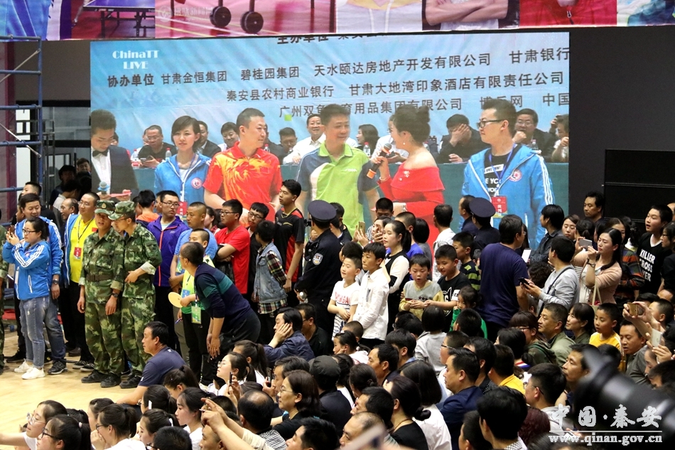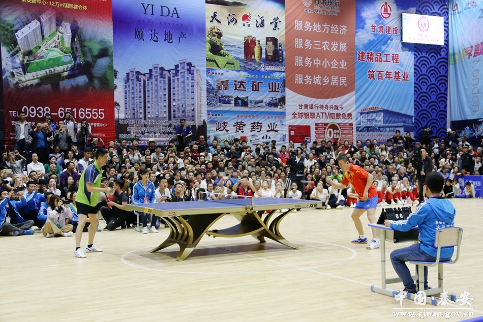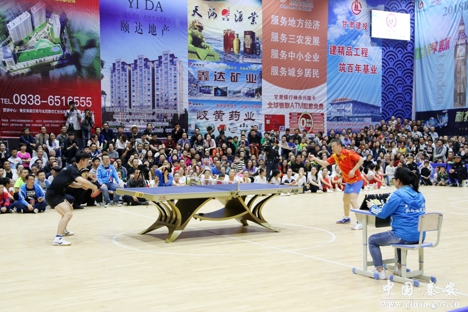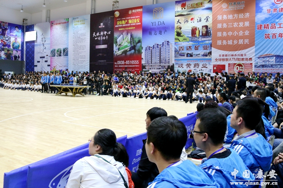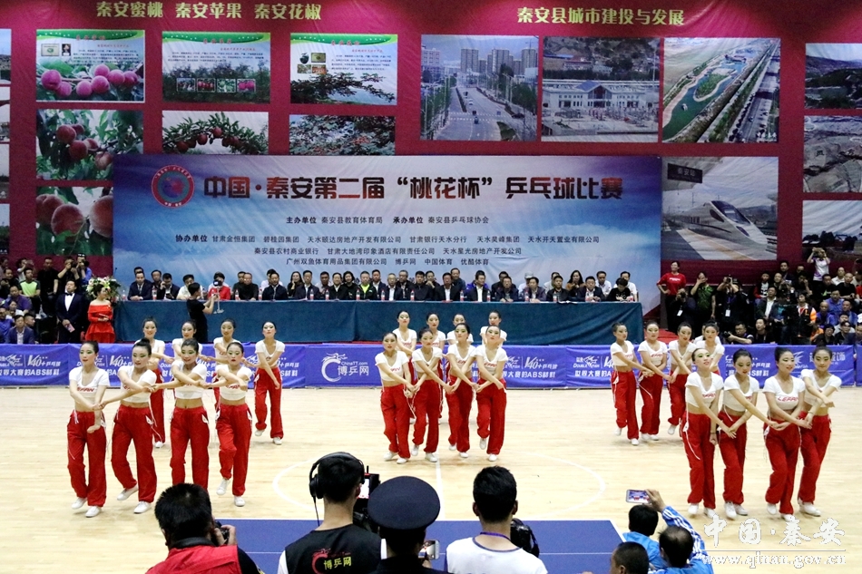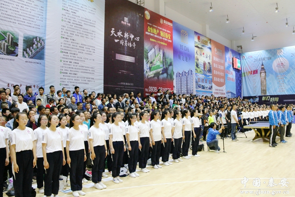 天天天水网讯据秦安县政府网消息 4月29日晚8时30分,在雄壮的国歌声中,中国·秦安第二届“桃花杯”乒乓球比赛开赛仪式在秦安县全民健身中心隆重开幕。