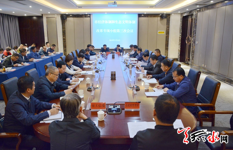 天天天水网讯【记者 胡丽霞】5月4日,市委常委、常务副市长、市经济体制和生态文明体制改革专项小组组长赵卫东主持召开市经济体制和生态文明体制改革专项小组第三次会议,贯彻落实市委全面深化改革领导小组会议第六次会议精神,总结1至4月份改革进展情况,分析存在的突出问题,审议相关改革方案,安排部署下一阶段改革重点任务。副市长、专项小组副组长何东出席会议。