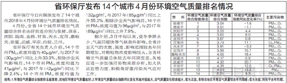 甘肃省环保厅发布14个城市4月份环境空气质量排名情况