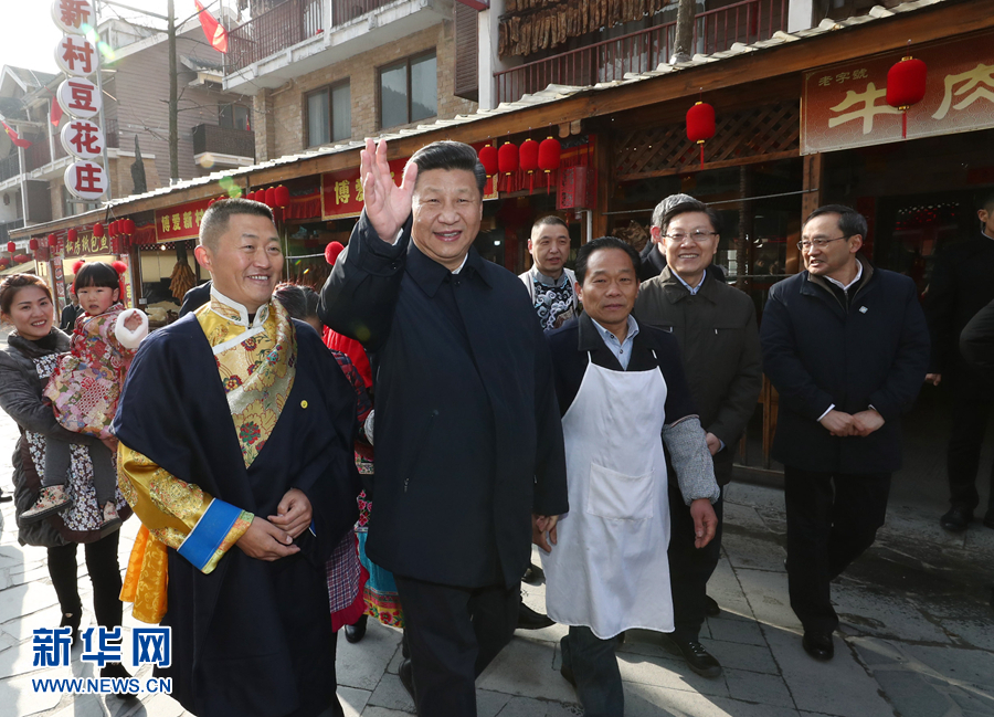 2018年2月12日上午,习近平在阿坝藏族羌族自治州汶川县映秀镇看望慰问群众。 新华社记者 鞠鹏 摄