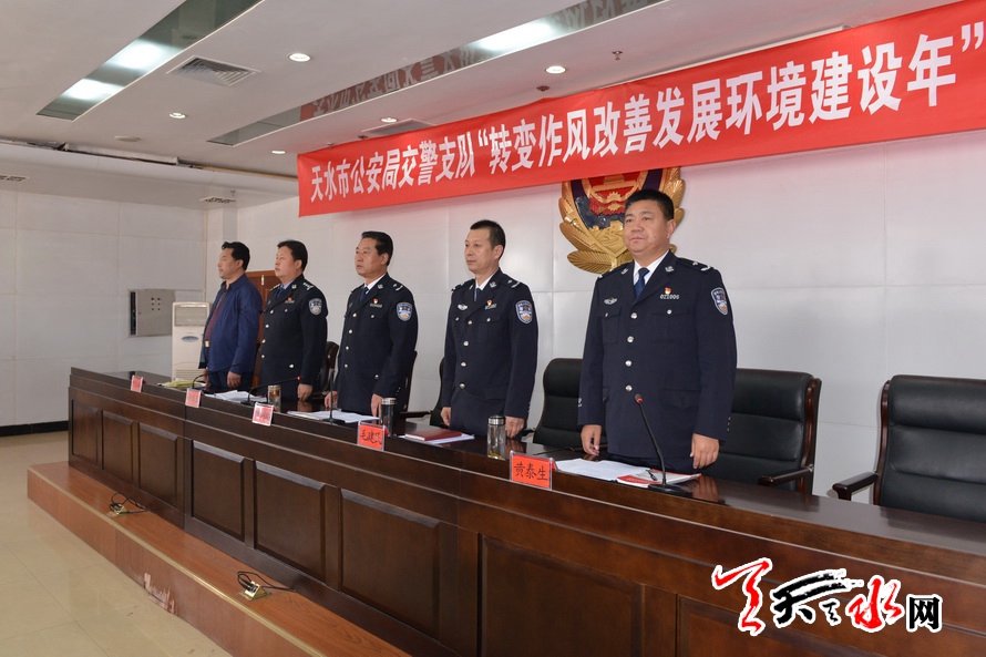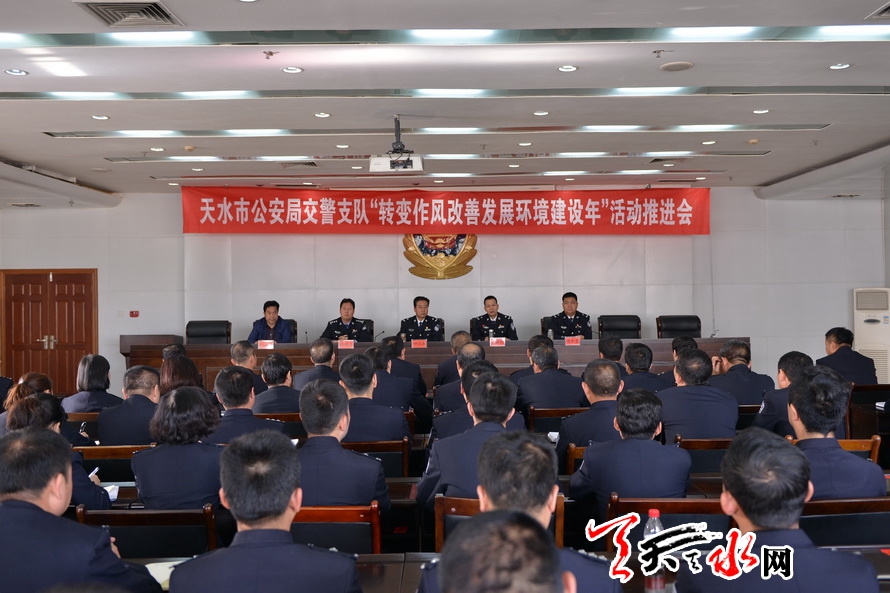 市公安局交警支队副政委黄泰生主持会议,并就贯彻落实会议精神提出具体要求。会上,支队政委毛建民组织大家学习了《天水市公安局交警支队机关深入开展“转变作风改善发展环境建设年”活动实施方案》,副支队长许维正宣读了《关于进一步转变政府工作作风的“十不准”规定》。支队机关全体民警,各直属大队班子成员共120余人参加会议。
