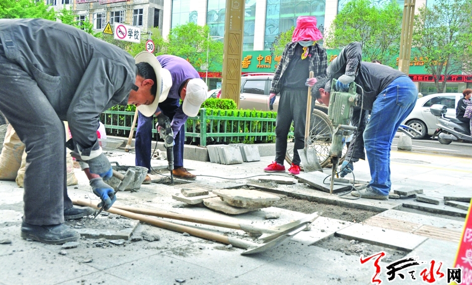11日,在民主东路市六中前新建的花坛旁边,建筑工人正在铺设人行道地砖,附近路段还有几位工人在对已经破损的地砖进行更换;在建设路市第一人民医院附近,施工人员正在对坑洼破损的机动车道路面进行补修,确保道路平整、完好。看到工人们正在补修平整人行道,市民李先生高兴地说:“下雨天最烦恼的便是踩到松动的地砖上,明明看着是实的,但一脚踩下去,仿佛踏进了一个水坑,水花四溅,顿时鞋袜透湿。进入夏季后雨水明显渐多,现在人行道经过整修后,下雨天走在路上,再也不怕污水溅一身了。”