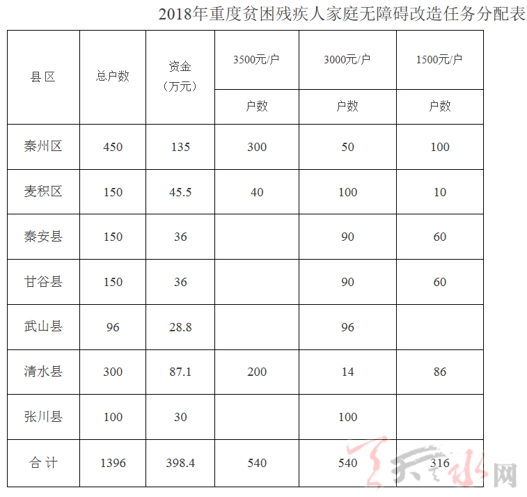 2018年完成省上下达我市危房改造任务11851户(建档立卡贫困户4332户,非建档立卡贫困户2572户,其他农户4947户)。其中:秦州区2649户(建档立卡贫困户1272户,非建档立卡贫困户596户,其他农户781户);麦积区1130户(建档立卡贫困户464户,非建档立卡贫困户185户,其他农户481户);清水县544户(建档立卡贫困户214户,非建档立卡贫困户138户,其他农户192户);秦安县4930户(建档立卡贫困户1427户,非建档立卡贫困户806户,其他农户2697户);甘谷县735户(建档立卡贫困户383户,非建档立卡贫困户307户,其他农户45户);武山县620户(建档立卡贫困户268户,非建档立卡贫困户164户,其他农户188户);张家川县1243户(建档立卡贫困户304户,非建档立卡贫困户376户,其他农户563户)。(具体实施改造户数以省上调整后下达的年度计划为准。)
