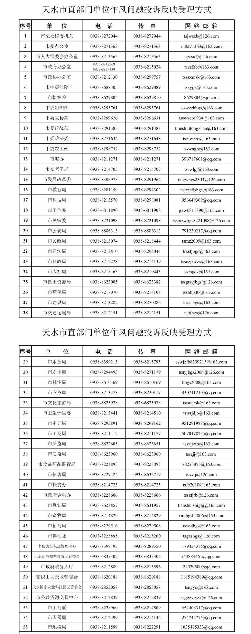 为广泛接受社会各界对全市转变作风改善发展环境活动的监督,现向社会统一公布55个市级部门作风问题投诉反映电话和网络邮箱,欢迎广大群众、企业客商通过公布的电话和网络信箱投诉反映相关部门在作风建设和服务发展方面存在的突出问题。市作风办将加大跟踪督办力度,主动督促相关部门及时有效解决问题。如投诉反映的问题得不到有效解决,可直接向市作风办反映。