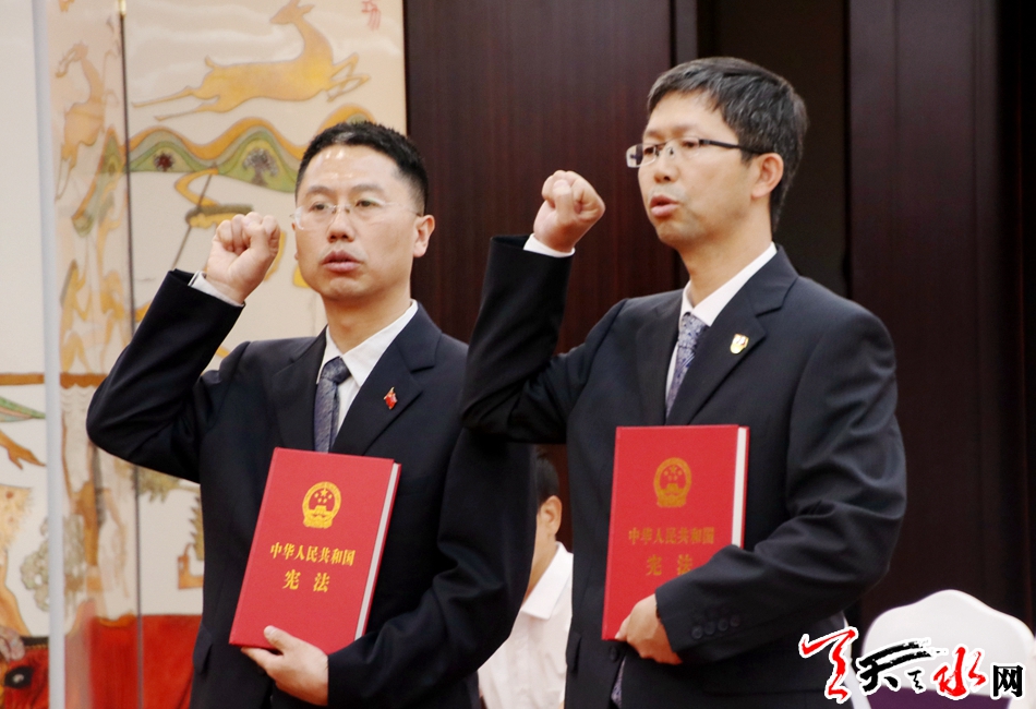 天天天水网讯【全媒体记者马放】为彰显宪法权威,激励和教育国家工作人员忠于宪法、遵守宪法、维护宪法,加强宪法实施,根据《全国人民代表大会常务委员会关于实行宪法宣誓制度的决定》,市七届人大常委会第十三次会议于5月16日下午第二次全体会议后举行决定任命人员宪法宣誓仪式。