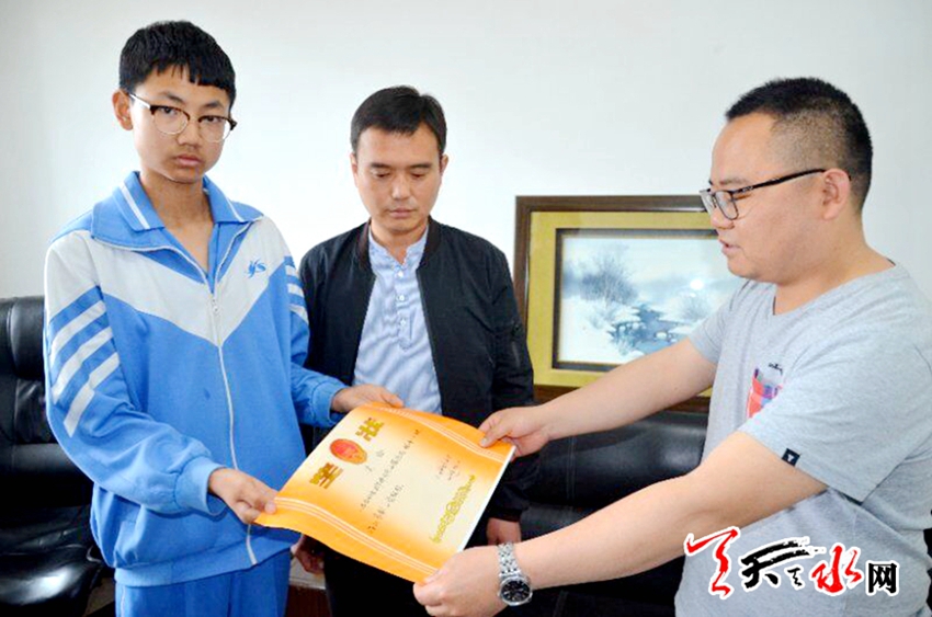 王华烨同学是育生中学八年级五班的学生,两天前在上学经过伏羲庙步行街时,发现一个黑色钱包。当时,他捡起来,感觉钱包沉甸甸地,打开一看,里边有厚厚的一沓百元钞票,还有数张银行卡、身份证和一张健身卡。他环顾四周,清晨的大街,显得冷清,并无行人。他便赶到学校,毫不犹豫地将钱包交给班主任胡萍老师。在学校政教处和西关派出所的共同努力下,终于在两天后找到了失主曹先生。