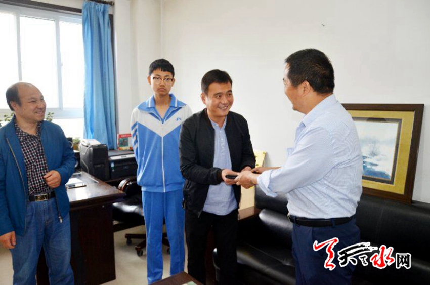 天天天水网讯(通讯员 张斌武)5月18日上午,天水市育生中学走进一位特殊的客人,他一手提着一个崭新的书包,一手拿着一面锦旗,锦旗上写着:“拾金不昧,品德高尚”八个大字!