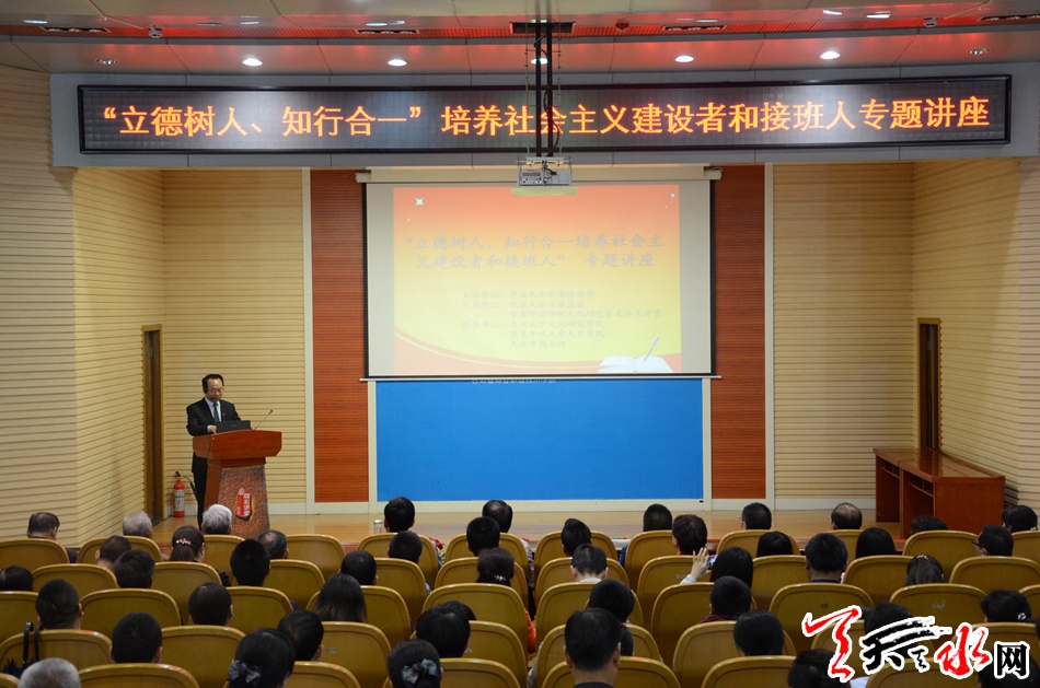 天天天水网讯【记者闫波】5月19日,2018年全市统战系统大宣讲之一“立德树人 知行合一——培养社会主义建设者和接班人”专题讲座在市图书馆举办。活动邀请了平凉市政协副主席、民盟平凉市委主委、甘肃医学院院长朱建国主讲。市人大常委会副主任安志宏出席并聆听讲座。