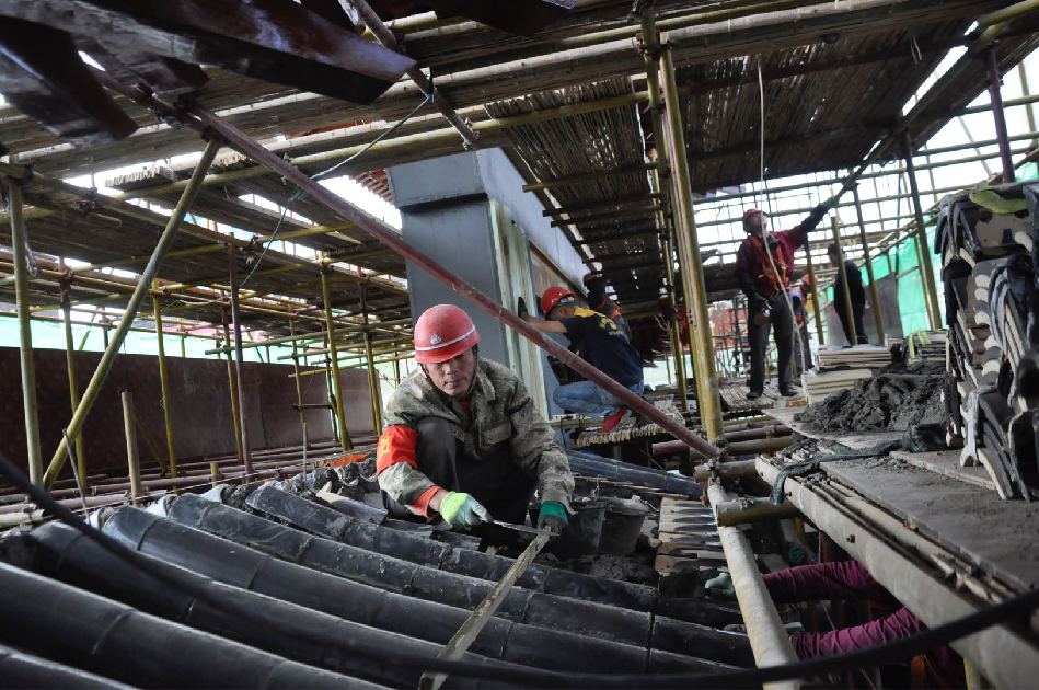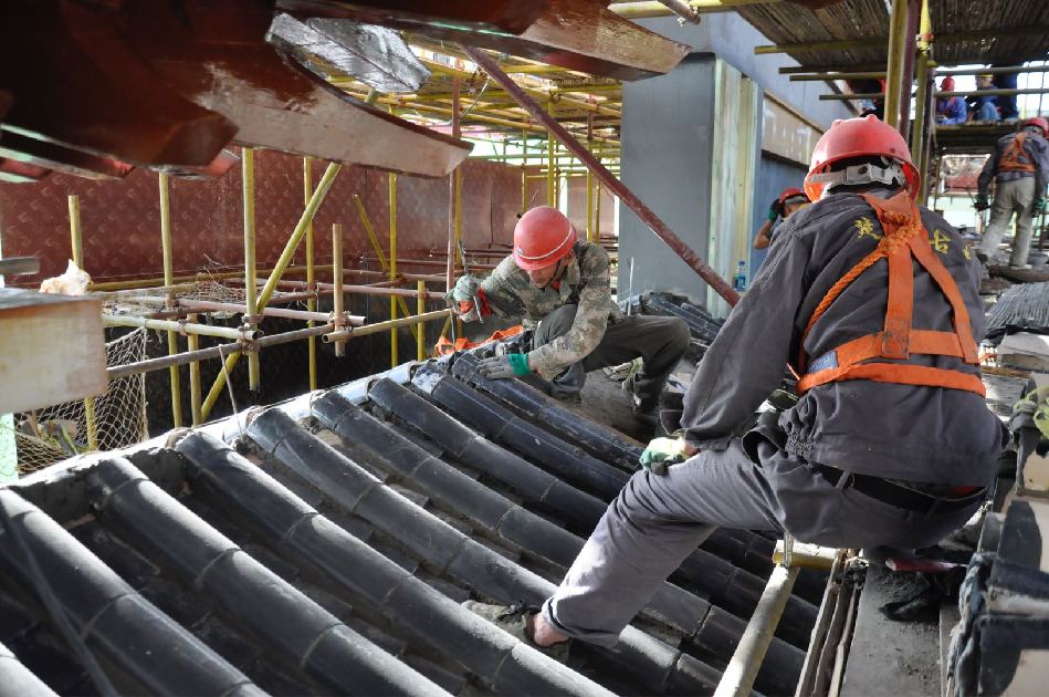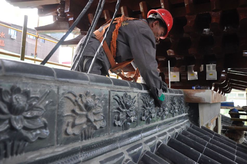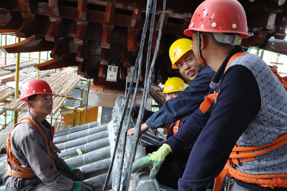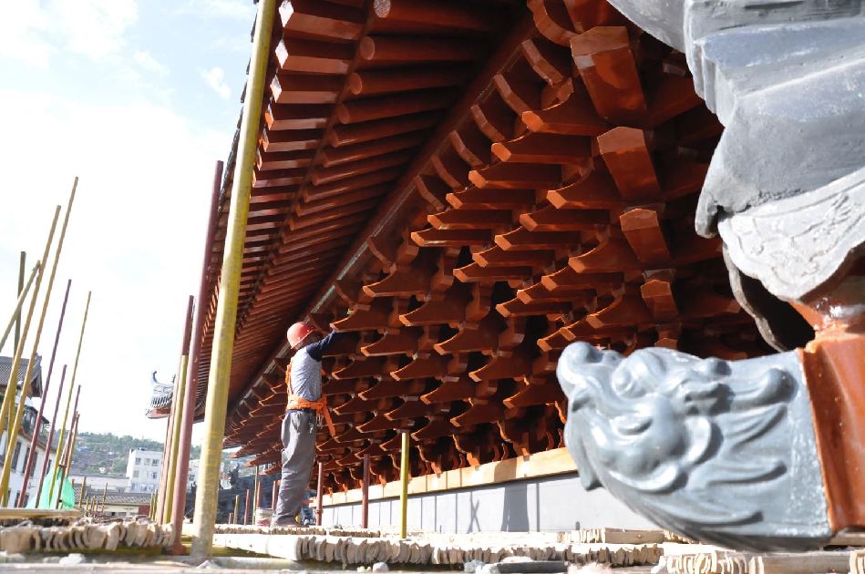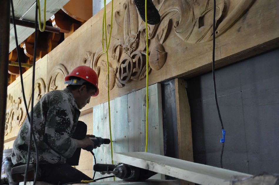 5月23日,记者在征得施工单位的同意后,攀上施工平台,亲眼目睹了解放路建设永久性仿古牌坊歇山顶、额枋、门枋、平板、花板等的施工进展情况。据介绍,牌坊主体为钢构建筑,额枋、门枋、平板枋、花板均为雕刻好花纹后用螺丝固定在钢体上,在采用补缝、油漆等工序使其达到仿古建筑的效果。牌坊歇山顶基部采用木质拱斗重叠的建筑手法,顶部采用清灰色琉璃瓦和脊兽,悬空挑檐,雕梁画栋。在施工现场,部分雕有梅花、祥云的花瓣也已经安装到位,歇山顶木质拱斗的粉刷、油漆全部完工,工人们正在加紧轮班对额枋、门枋的木质包板进行加固,抢赶工期。同时,牌坊顶部的灯光照明也已经安装到位,据现场施工人员介绍,正楼歇山顶四周安装了近200盏LED冷光照明灯。10多平方米的“西关”木板雕刻已经两个龙图腾雕刻也已经全部完成,只待吊装。