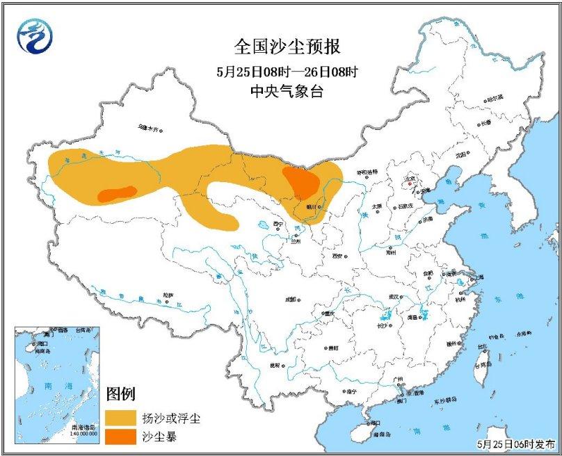 25日至26日,受大风影响,西北、华北中北部等地的部分地区自西向东将有一次沙尘天气过程,其中25日08时至26日08时,新疆南疆盆地、青海西北部、内蒙古西部、甘肃河西、宁夏北部等地的部分地区有扬沙或浮尘天气,其中新疆南疆盆地、内蒙古西部局地有沙尘暴。因此,中央气象台发布沙尘天气预报。