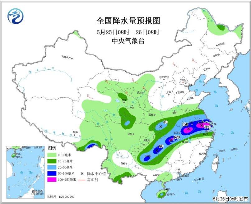 中央气象台5月25日06时继续发布暴雨黄色预警:预计25日08时至26日08时,河南东南部、苏皖中南部、上海、浙江北部、湖北中东部和西北部、湖南北部、贵州东部和南部、重庆东北部等地有大到暴雨,其中,安徽中部偏南地区、江苏南部、湖南北部等地局地有大暴雨(100~160毫米);上述部分地区并伴有短时强降水、雷暴大风等强对流天气,最大小时降水量40~60毫米。